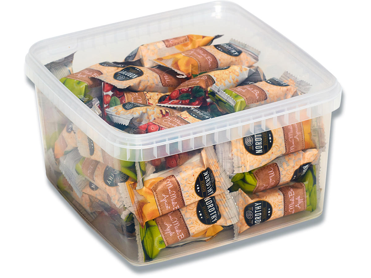 Sukker, glukosesirup, ristede solsikkekerner (solsikkekerner, rapsolie, antioxidanter (E320, E330, E1520)), vekaobund (flormelis, palmekerneolie, kakaopulver, emulgatorer (SOJALECITHIN, polyglycerolestere af fedtsyrer), salt, aroma), hakkede tørrede æbler (11%), ristede JORDNØDDER (10%), vallepulver (MÆLK), palmeolie, HAVREGRYN, puffede ris (rismel, majsmel, HAVREMEL, flormelis, salt), SESAMFRØ, fugtighedsbevarende middel (sorbitol), SKUMMETMÆLKSPULVER, salt, stabilisator (mono- og diglycerider af fedtsyrer), surhedsregulerende middel (citronsyre), naturlig aroma, emulgator (SOJALECITHIN). Kan indeholde spor af byg, rug og hvede.