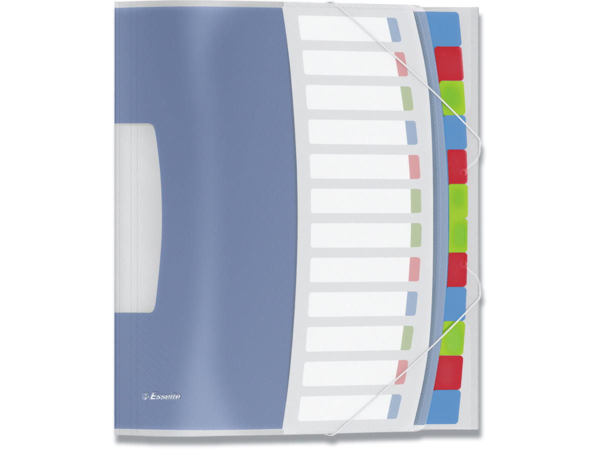 Kvalitets PP sorteringsmappe i levende farver og lækkert VIVIDA design. 12 farvede faner, lettere gennemsigtig 0,5 mm PP materiale. Høj kapacitet. Til organisering og opbevaring af dokumenter.