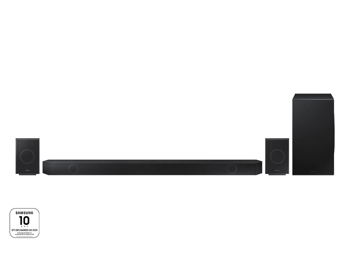 Samsung HW-Q935D. Lyd-output kanaler: 9.1.4 kanaler, Lyddekodere: Dolby Atmos, Dolby Digital Plus, Dolby TrueHD, Equalizer, funktioner: Adaptiv, Game Pro, Nat, Standard, Udvidelse af surround sound. Subwoofer forbindelse: Trådløs. Produktfarve: Sort, Titanium, HDR-teknologi (High Dynamic Range): High Dynamic Range 10+ (HDR10 Plus), Understøttede lydformater: AAC, AIFF, ALAC, FLAC, MP3, OGG, WAV. Forbindelsesteknologi: Kabel & trådløs. Soundbar strømforbrug: 42 W, Subwoofer strømforbrug: 28 W, Strømforbrug (standby): 0,5 W