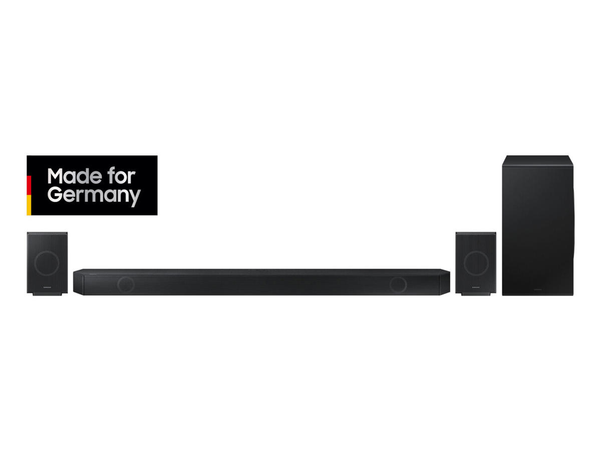 Samsung HW-Q995GD. Lyd-output kanaler: 11.1.4 kanaler, Udgangseffekt (RMS): 656 W, Lyddekodere: 3D Sound, DTS:X, Dolby Atmos, Dolby Digital Plus, Dolby TrueHD. Subwoofer forbindelse: Trådløs, Subwoofer RMS-effekt: 200 W, Woofer diameter (subwoofer): 20,3 cm (8"). Produktfarve: Sort, Understøttede lydformater: AAC, AIFF, ALAC, FLAC, LPCM, MP3, OGG, PCM, WAV, WMA, Kontrol med forbrugerelektronik (CEC): Anynet+. Forbindelsesteknologi: Trådløs, Bluetooth kodec: SBC. Soundbar strømforbrug: 41 W, Subwoofer strømforbrug: 26 W, Strømforbrug (standby): 0,5 W