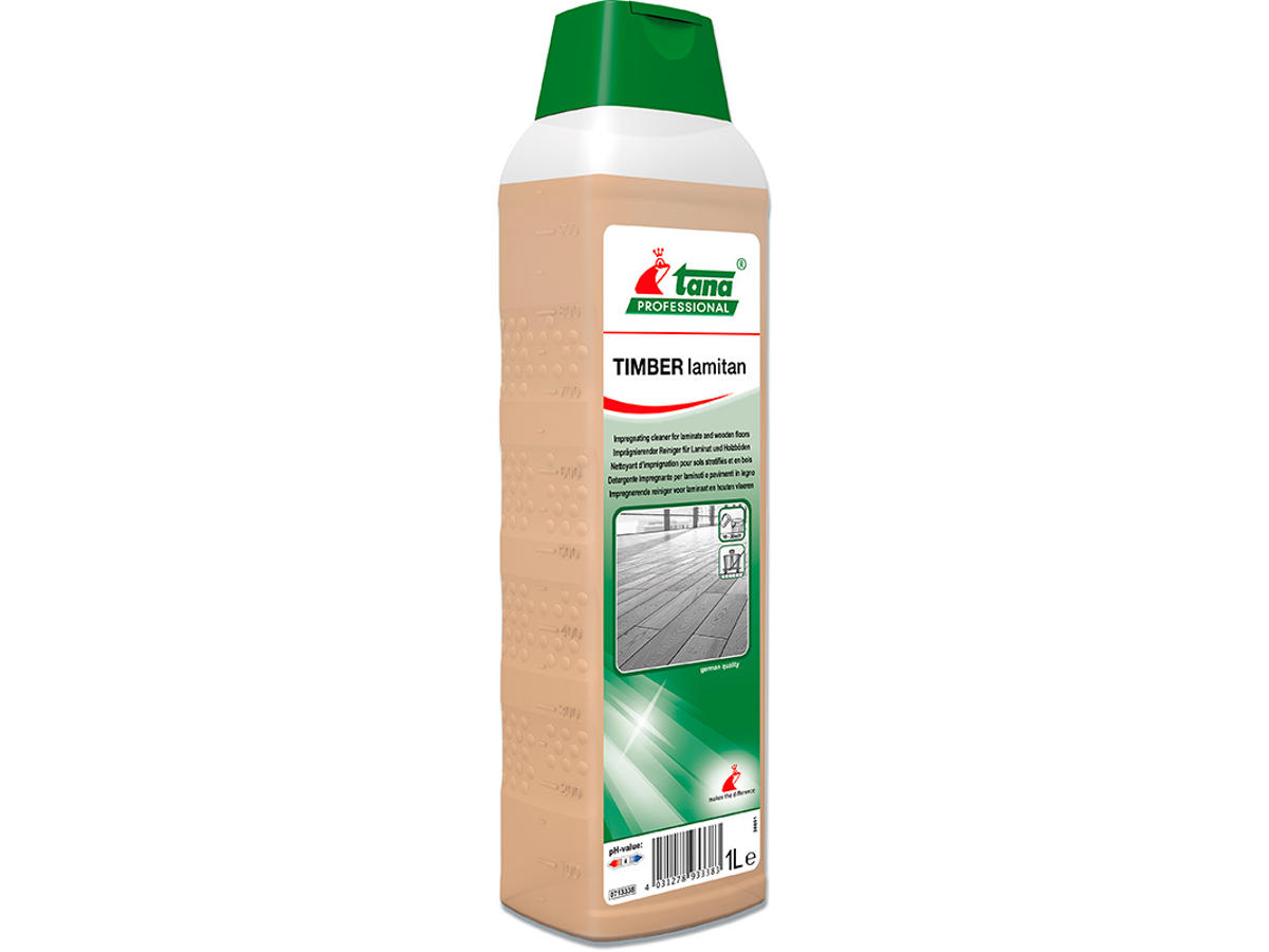 TIMBER lamitan er et yderst effektivt rengøringsprodukt til alle vandfølsomme og hårde gulvbelægninger. TIMBER lamitans højeffektive formel producerer en usynlig beskyttende film, som ikke skader gulvbelægningernes naturlige udseende eller gør dem glatte. Hvis TIMBER lamitan anvendes regelmæssigt som en del af en almindelig rengøringsrutine, skabes et beskyttende værn uden behov for yderligere polering. Selv samlingerne i laminatgulve eller forseglede parketgulve, som let absorberer fugt og svulmer op, beskyttes permanent imod indtrængning af fugt. TIMBER lamitan er ideelt egnet til vedligeholdende rengøring af al hård gulvbelægning i høj kvalitet, der let absorberer fugt og svulmer op, f.eks. uforseglede træbelægninger, laminat og korkgulve.