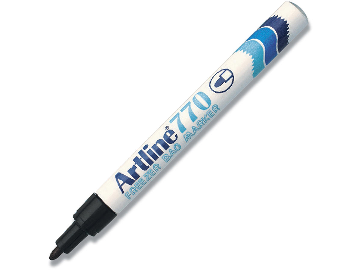 Pennen, der skriver på dine frostposer, plastbeholdere og andet emballage i køl eller på frost. Smitter ikke af efter opbevaring på køl/frost. Skriver på fedtede overflader. Tørrer hurtigt, resistent op til minus 25 grader, vandfast. Rund spids med 1mm skriverbedde. Alu beholder og plast hætte.