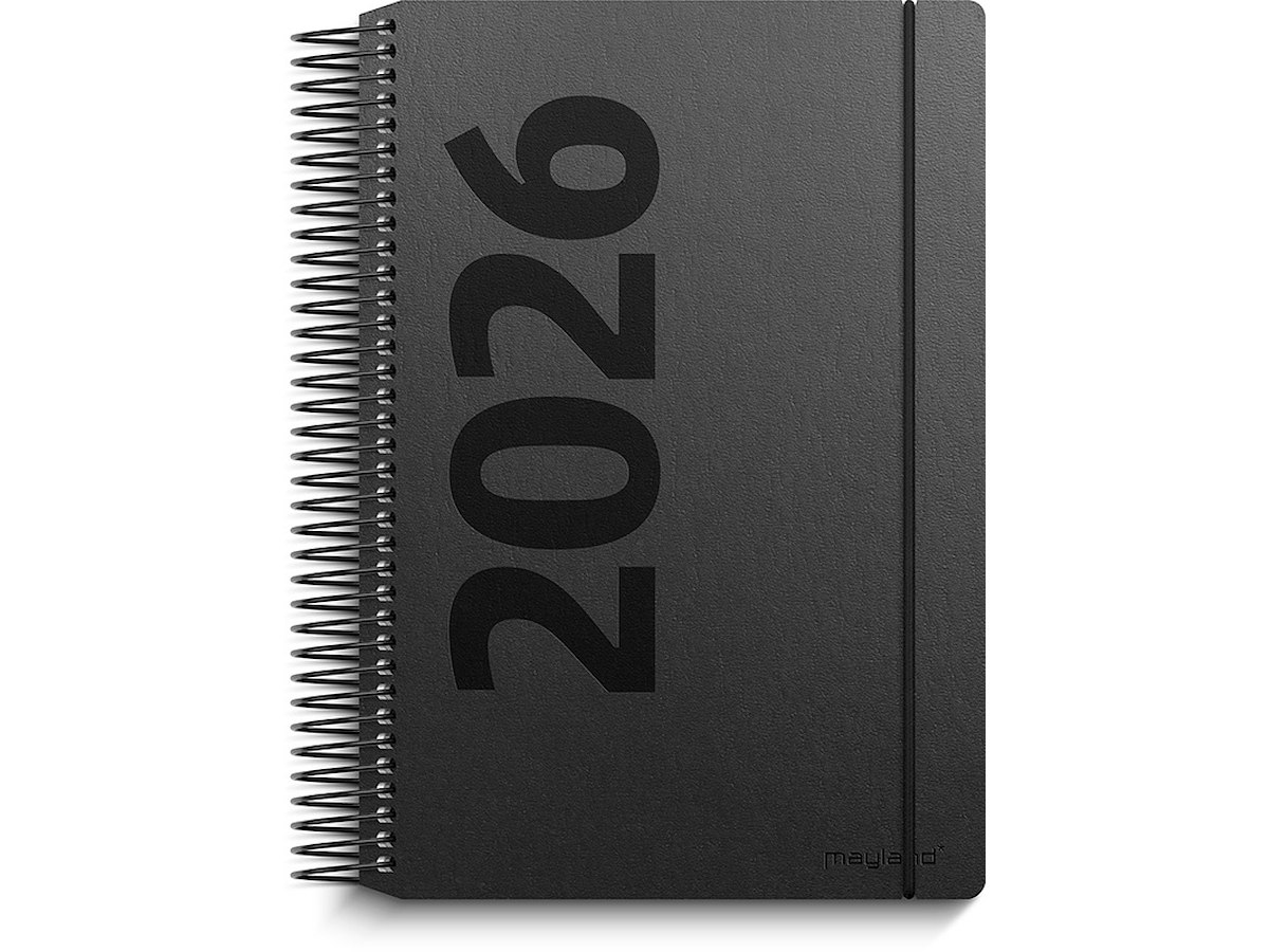 Dagkalender med en matsort forside. Kalenderen er spiralbundet med et omslag i genbrugskarton og holdes lukket med en sort elastik. Kalenderen er inddelt med en dag pr. side og indeholder et timeopdelt kalenderskema fra kl. 8-18 i moderne layout, så du nemt kan danne dig et overblik over dagens planer og aftaler. Dertil finder du en tidslinje og månedsoversigt nederst på hvert opslag, en udfoldelig årsoversigt, masser af praktisk information, stickerark samt en lomme til løse papirer bagerst i kalenderen.