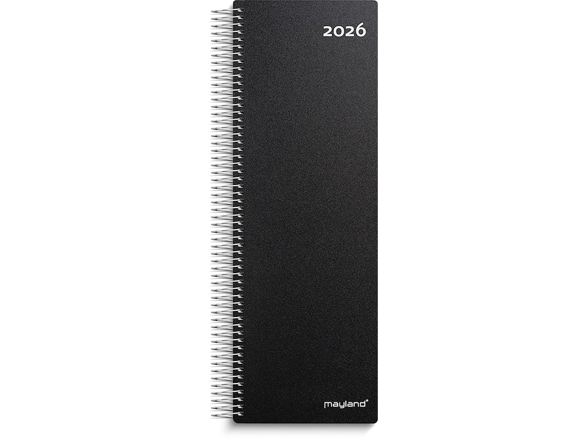 Smart noteringskalender med en sort forside. Kalenderen er spiralbundet med et omslag i hårdt PP-plast, hvilket giver kalenderen et enkelt udtryk. Kalenderen er inddelt med en dag pr. side og indeholder et noteringsskema fra kl. 7-18 med 15 minutters intervaller, hvilket giver dig mulighed for at notere dagens planer og aftaler til præcision. Dertil finder du en tidslinje og månedsoversigt nederst på hvert opslag samt noteringer kommende år.