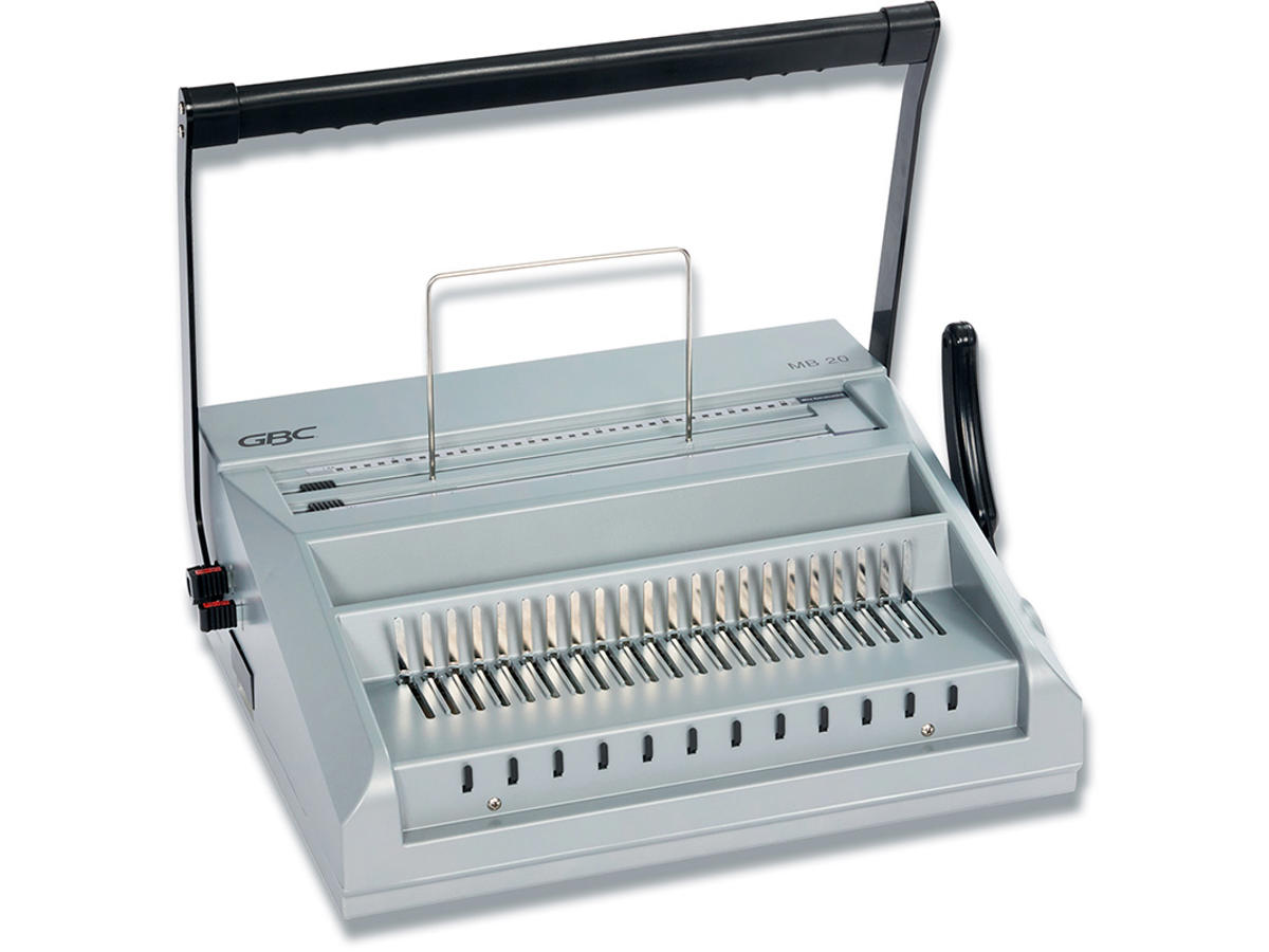 GBC MB20 er en holdbar multifunktionel indbindingsmaskine, der giver fleksibilitet til at producere Comb- eller Wire-indbundne dokumenter. Den er ideel til små og mellemstore kontorer og kombinerer et letvægtsdesign med praktisk og enkel betjening. Med kapacitet til at hulle op til 20 ark (70 g) på én gang kan den effektivt indbinde op til 270 ark med en 28 mm Comb eller 125 ark med en 14,3 mm - 34 ring Wire. Grå farve.