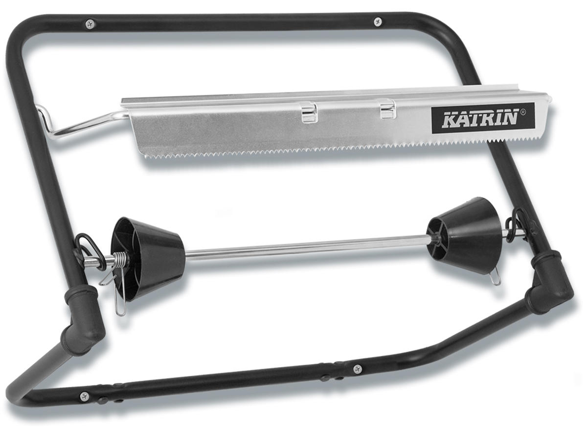 En robust og praktisk dispenser i sort metal til værksteds- og industriruller. Dispenseren kan håndtere ruller med en bredde op til 40 cm.
