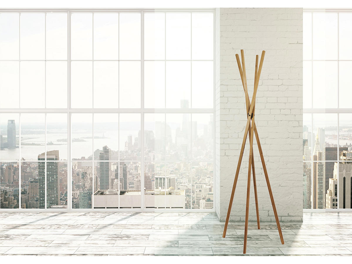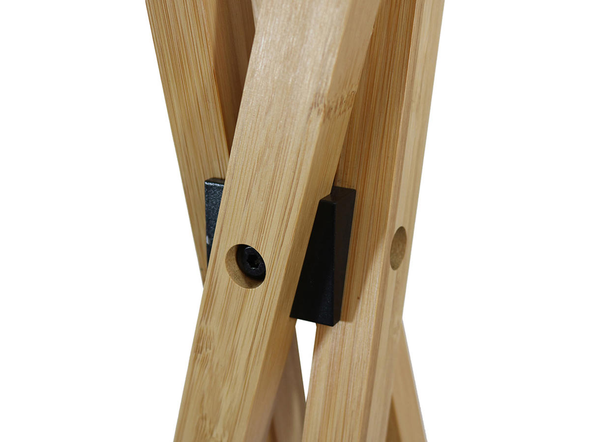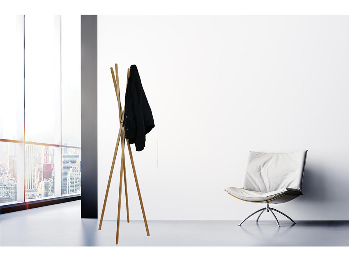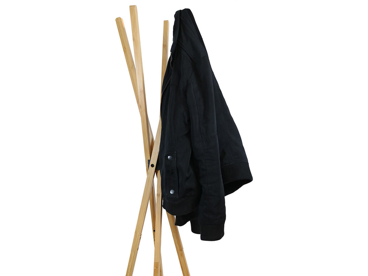 Tippy har fået sit navn fra dens facon. Tippy’s moderne nordiske design er både funtionelt og dekorativt. Tippy’s konstruktion gør den meget stabil og de 4 knager er udformet så de ikke skader tøjet. Fremstillet af bambus. Samlestykket er af sort aluminium.