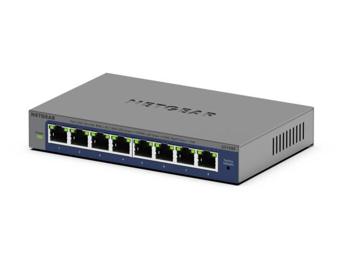 NETGEAR GS108Ev4. Switch-type: Ikke administreret, Switch lag: L2/L3. Basis omskiftning RJ-45 Ethernet porttype: Gigabit Ethernet (10/100/1000), Basis omskiftning RJ-45 Ethernet porte, antal: 8. MAC adresselabel: 4000 entries, Switch kapacitet: 16 Gbit/sek.. Netværksstandarder: IEEE 802.1Q, IEEE 802.1p, IEEE 802.3, IEEE 802.3ab, IEEE 802.3u, IEEE 802.3x. DC indgangsspænding: 12 V