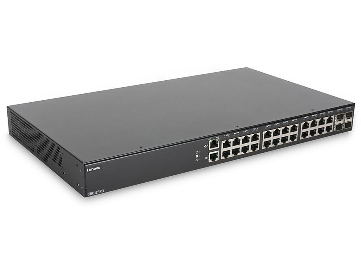 The Lenovo CE0128PB Switch is a 1/10 Gb Ethernet (GbE) switch with Power over Ethernet (PoE) that delivers a compact, high-density, cost-effective GbE solution for network environments where space and power are at a premium. Featuring a small, 1U footprint, this switch is designed for access-layer deployments in branches, retail and workgroup environments, and campus networks. It can also be used as a management network switch in the data center infrastructures.