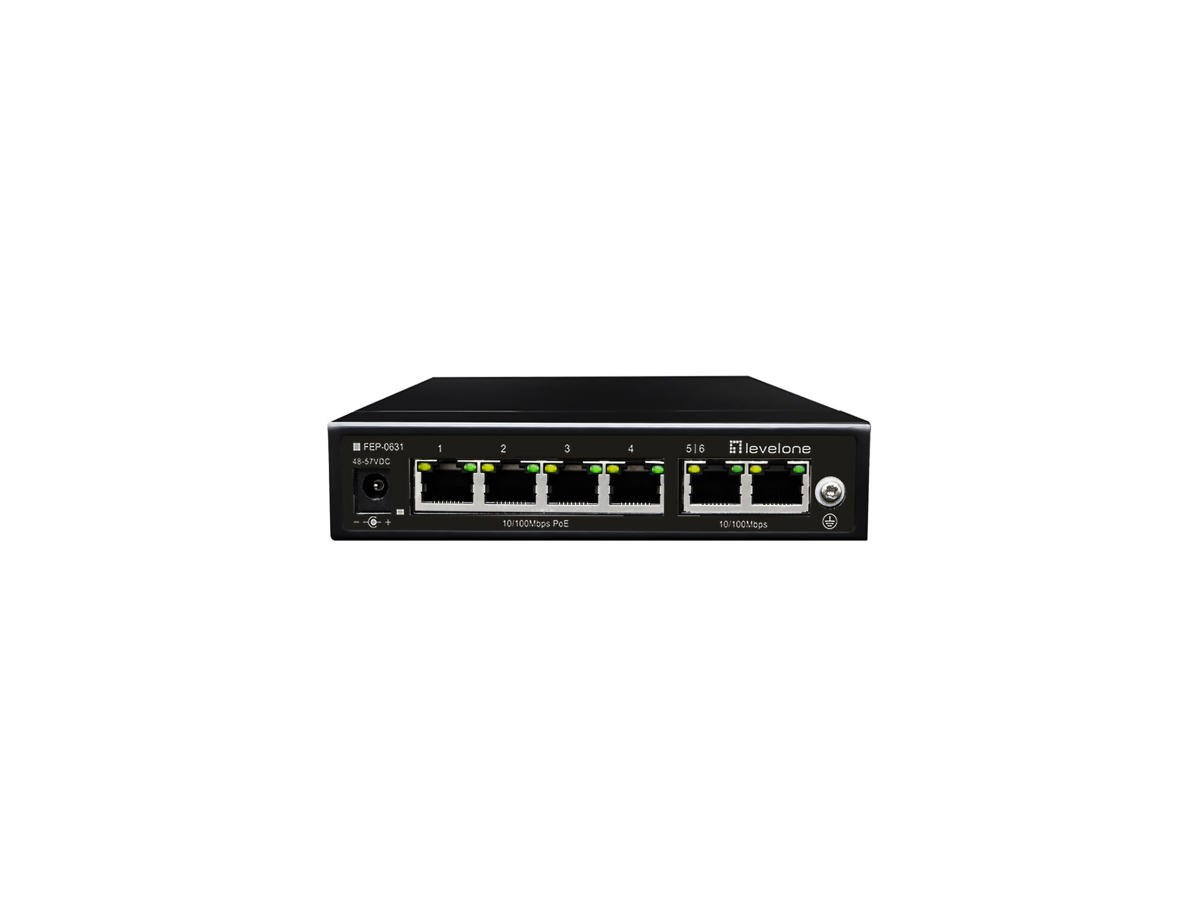 The LevelOne FEP-0631 is a Fast Ethernet PoE switch with a total of 6 ports, two of which is available as uplink port and 4 ports for Power over Ethernet. Per PoE port a power supply of up to 30W is possible. The total PoE power budget is 60W. Distances up to 250m at 10Mbps is supported. It is an ideal solution when users use a combination of PoE and non-PoE devices. The FEP-0631 four PoE-enabled ports make it the ideal solution for users using PoE-enabled devices in the workplace. This can include a mix of PoE IP phones, PoE Wifi APs and PoE IP cams. It is the perfect solution for environments that want to upgrade their equipment and LAN infrastructure to PoE capability. The switch automatically detects the connected IEEE 802.3at/af standard device and provides these devices with power and data over a single cable. In addition, the FEP-0631 enables users to provide a stable and reliable high-speed LAN environment with store-and-forward switching architecture, packet error filtering and blockage-free packet forwarding. The 802.3x flow control mechanisms operate in both full and half duplex modes. This device supports the N-Way Auto Negotiation protocol, which automatically detects network speed and duplex mode.For instant fault detection, the FEP-0631 is equipped with a full range of LEDs to help monitor and troubleshoot the network.