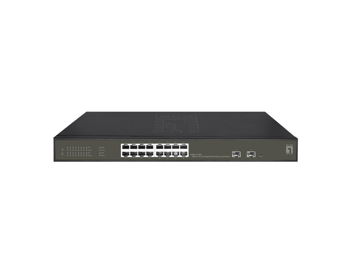 The LevelOne GES-2118P Hilbert gigabit PoE smart lite switch is a next-generation Ethernet Switch offering powerful better PoE functionality and usability that delivers the cost-effectively business and transports Ethernet services via fiber or copper connections. GES-2118P delivers 16 (10M/100M/1G) RJ45/PoE+ (Support 802.3at/af, and total up to 230W) ports and 2 Gigabit SFP ports. can be matched with the latest LevelOne IP Locator, the software is the easiest to use switch discovery tool, it can search all Hilbert series switches, instantly know the forgotten IP and other info. Compatible with mainstream Windows and Mac operating systems.