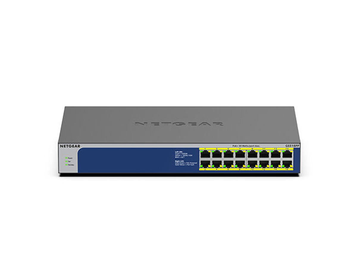 The NETGEAR Gigabit Unmanaged Switch series helps your business cost-effectively expand your network to Gigabit speeds and higher port counts. The GS516PP joins the series and offers 16 PoE+ ports to power high-power PoE devices. With a total PoE power budget of 260W, deploy denser PoE+ devices to a single switch rather than multiple