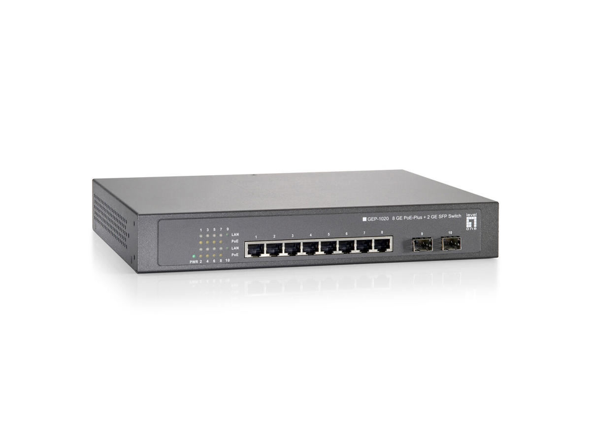 LevelOne GEP-1020 provides 8 x 10/100/1000Base-T PoE-Plus ports and 2 x 1000Base-X SFP (Small Form Factor Pluggable) slots. This switch is IEEE 802.3af/at compliant, providing power and data over a single Ethernet cable to any PoE device, with total power budget of 150W, up to 30W per port. Together with Energy Efficient Ethernet (IEEE 802.3az) standard compliant, it substantially lower power consumption during periods of low-link utilization. Moreover, supports Gigabit Ethernet connectivity with 9K jumbo frames for network performing enhancement. Ideal for small businesses that prefers an affordable solution for PoE deploying infrastructure.