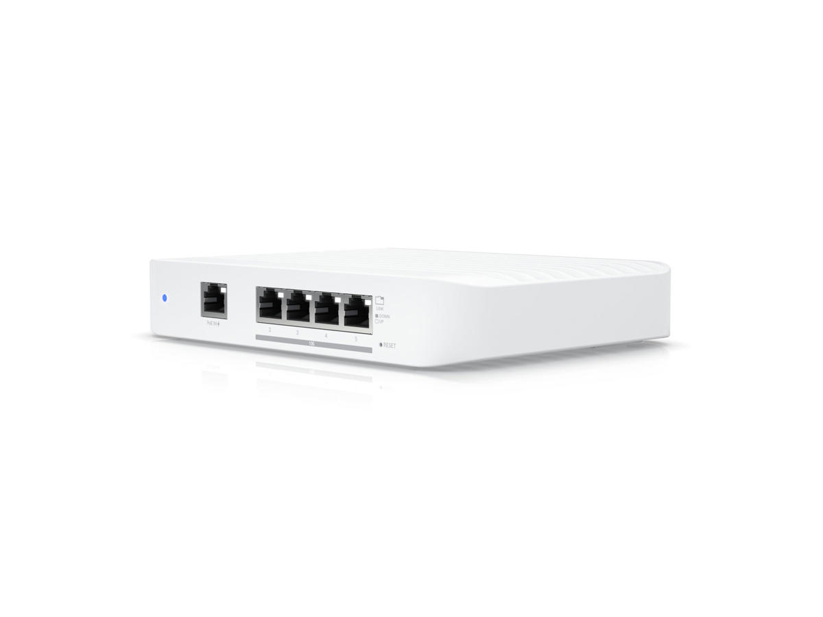 A compact, 5-port, Layer 2 switch that supports 10 GbE speeds and can be powered with PoE or a 5V USB-C adapter.