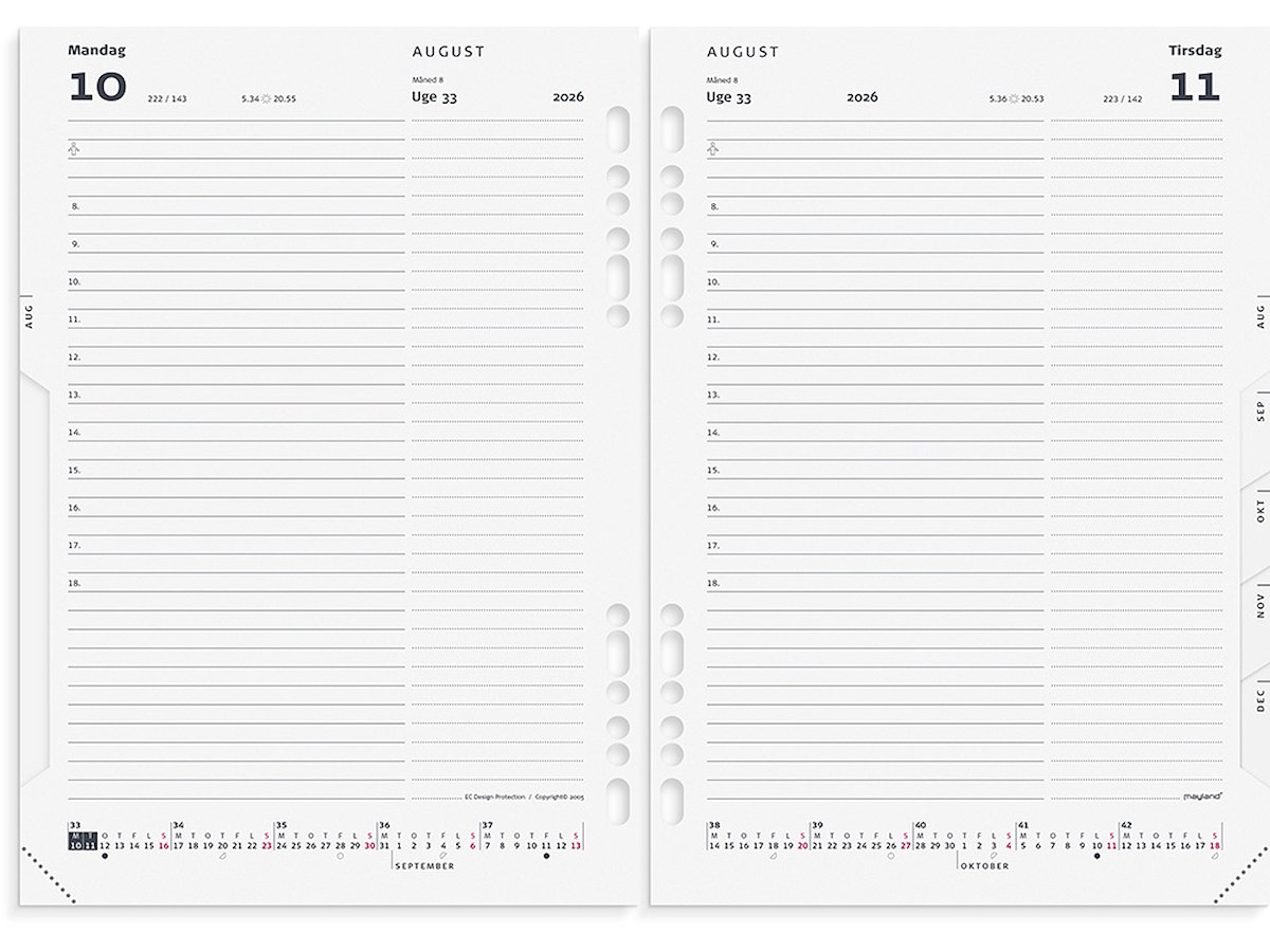 Dagskalender refill til din A5 systemkalender. Kalender-refillen har multihuller og masser af skriveplads, så du nemt kan overskue dagens planer og aktiviteter. Kalenderen er inddelt med en dag pr. side og med et timeopdelt kalenderskema i moderne layout fra kl. 8-18. Dertil finder du en tidslinje og månedsoversigt nederst på hvert opslag, en udfoldelig årsplanner, projektplanner, atlas i farver, masser af praktisk information, lynopslag samt separat mappe med index planner og telefonregister.
