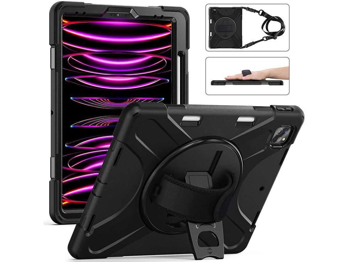 Shockproof cover designed for every day use. It is equipped with a hand strap for a firm grip. The built-in 360° rotatable kick stand makes it possible to use the tablet in both horizontal and vertical position. Built-in air cushion protection safeguards the tablet corners if the tablet is dropped. The raised sides around the camera cutout, offers better drop protection for the camera. All buttons are protected, but can easily be operated as well as there is easy access to all ports. The cover does not include a front glass. The cover is a three layer cover with a hard PC inner cover (2 parts) as well as a silicone skin.