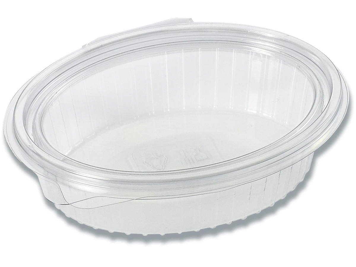 Salatbæger med låg, 370ml, 167x131x45mm, Oval, Hængslet låg, RPET, Klar, 600stk, Multiline Clearshow