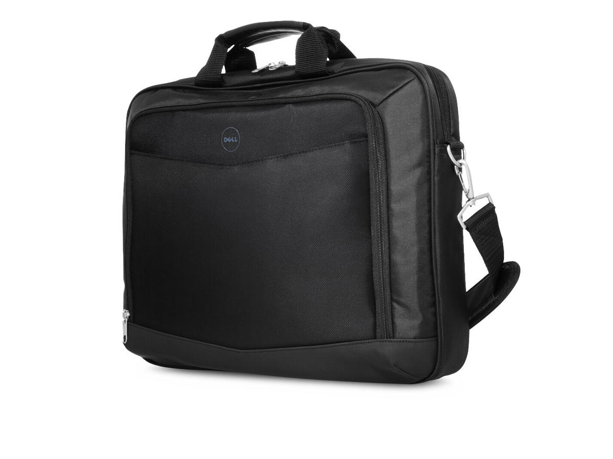 Sophisticated professional styling for the business user. Business-minded design offers a well-padded, protective laptop compartment, ergonomic comfort and abundant organizational features. Accessory storage area organizes business cards, pens, credit cards and other items and features a separate mesh compartment. A separate, divided storage section keeps files and documents neat and tidy. Dual top pockets provide quick access to items such as phone or keys, and the large zippered front pocket stores passport and other travel documents. Padded carry handles and ergonomic shoulder strap deliver comfortable carrying, while sturdy hardware and ergonomic zipper pulls add comfort and reliability. A discrete luggage strap makes piggybacking on wheeled luggage a breeze. Water-resistant fabric provides added protection for contents. Fits up to 14'' (36 cm) Dell™ laptops.