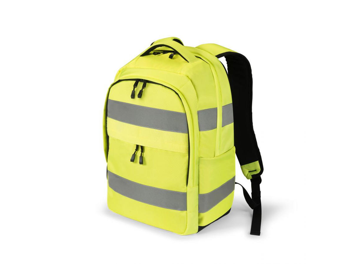 With its high-visibility backpacks, DICOTA offers a reliable solution for challenging work days outdoors. All products meet important procurement criteria, including ergonomics, durability and sustainability. The highest level of quality and functionality meets sustainable materials made from recycled PET bottles -protecting both employees and the environment. The use of fluorescent fabrics and 3M reflective strips in line with EN ISO 20471:2013 means the backpacks offer excellent visibility, thus improving safety at work in outdoor areas like construction sites and forests and for rescue operations as well as on the way to work. The outer material is water-repellent, certified under EN ISO 4920, Level 4, and the rain cover supplied provides additional protection for heavy downpours. The air-flow system on the back guarantees pleasant air circulation when temperatures rise. The adjustable hip and chest straps ensure comfortable weight distribution and the best ergonomics. The 25 litres of storage space can efficiently store work accessories as well as personal items. The notebook is fully protected with the tried-and-tested fit-all system. There are also compartments for tablet, smartphone, power bank, torch, etc., as well as universal zipped compartments. Valuables can be safely stored in the compartment on the back to prevent theft. A business card pocket and the Velcro area on the back allow you to personalise the backpack with a name or logo patch. The backpack Hi-Vis 25 litres offers maximum space, comfort and visibility and is perfect for a demanding day working outdoors. It also improves safety at work while helping to prevent accidents. -