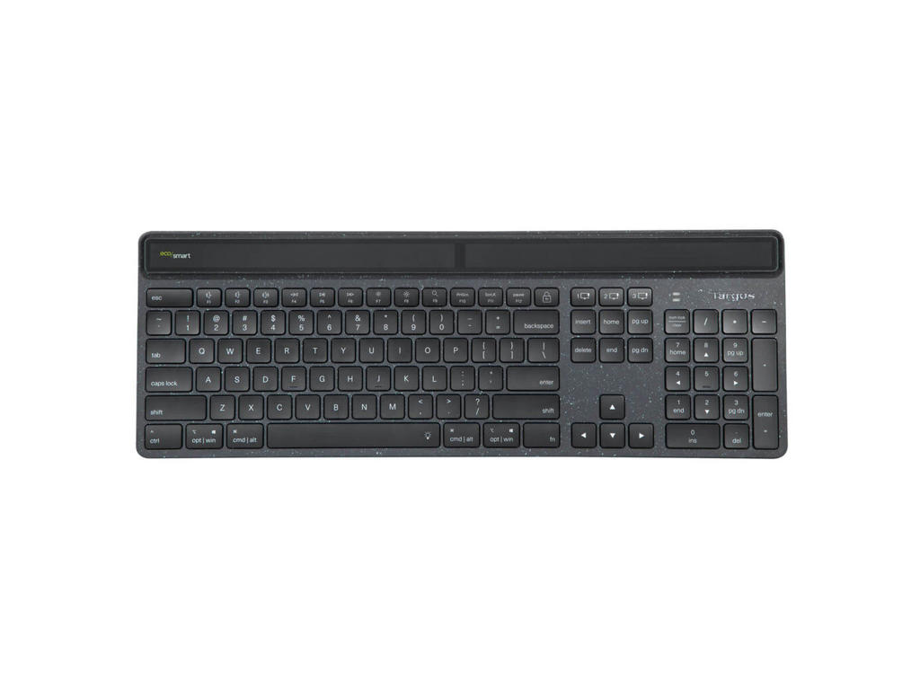 The Targus® Sustainable Energy Harvesting EcoSmart™ German-language Keyboard combines Bluetooth® and advanced solar technologies with post-consumer recycled materials in an eco-friendly, full-size keyboard. Manufactured from up to 85% recycled material and infused with antimicrobial protection, this keyboard helps to prevent the growth of micro-organisms, while helping to protect the environment - even its packaging is recycled. It’s primarily powered by solar cells optimised to harvest light from a variety of light conditions (including indoor artificial lighting) and connects to up to 3 devices using Bluetooth® SoC, which means its extremely low-power capabilities makes it 3 to 4 times more power-efficient than other Bluetooth keyboards. And, this keyboard features Targus DefenseGuard™ Antimicrobial Protection. Unlike topically applied sprays, this DefenseGuard keyboard is infused with antimicrobial additives that don’t wear or wash off, and works continuously for the life of the product.