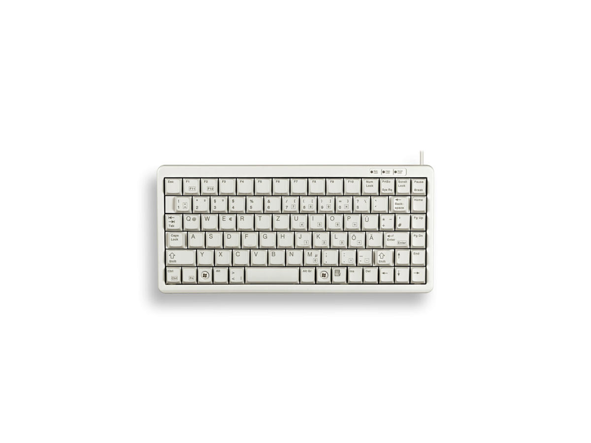 CHERRY G84-4100. Tastatur formfaktor: Mini. Tastatur stil: Lige. Forbindelsesteknologi: Ledningsført, Enhedsgrænseflade: USB, Tastatur nøglekontakt: Mekanisk, Tastaturopsætning: QWERTY, Antal taster på tastatur: 86. Kabellængde: 1,75 m. Anbefalet brug: Universel. Produktfarve: Grå