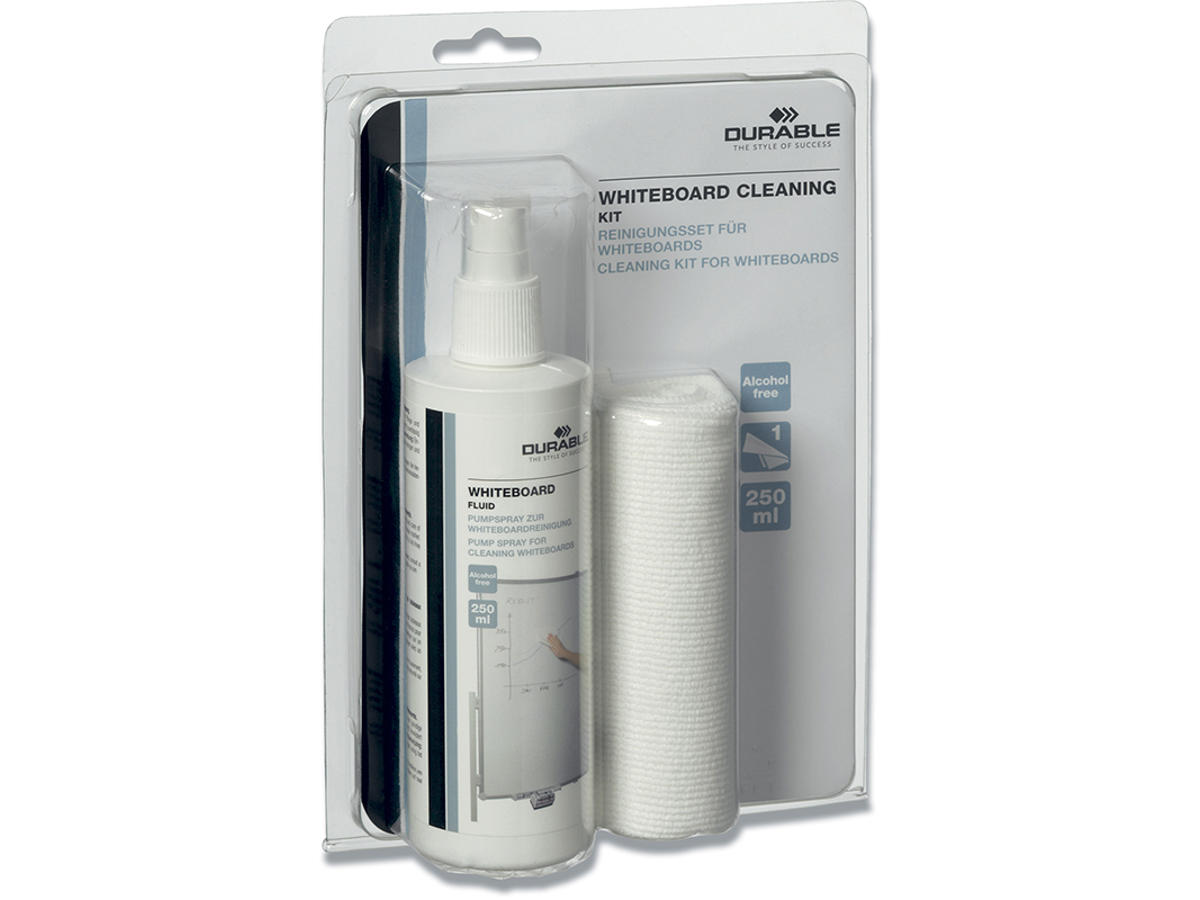 Rensesæt med rensespray og microfiberklud til rengøring af whiteboardtavler. Uden alkohol. Spray lidt væske på kluden, rens og tør tavlen. Fjerner snavs, fedtfingre og blækrester. Renser og beskytter whiteboardtavlens overflade varigt. Indhold: 250 ml spray og en mikrofiber klud (25x25mm).