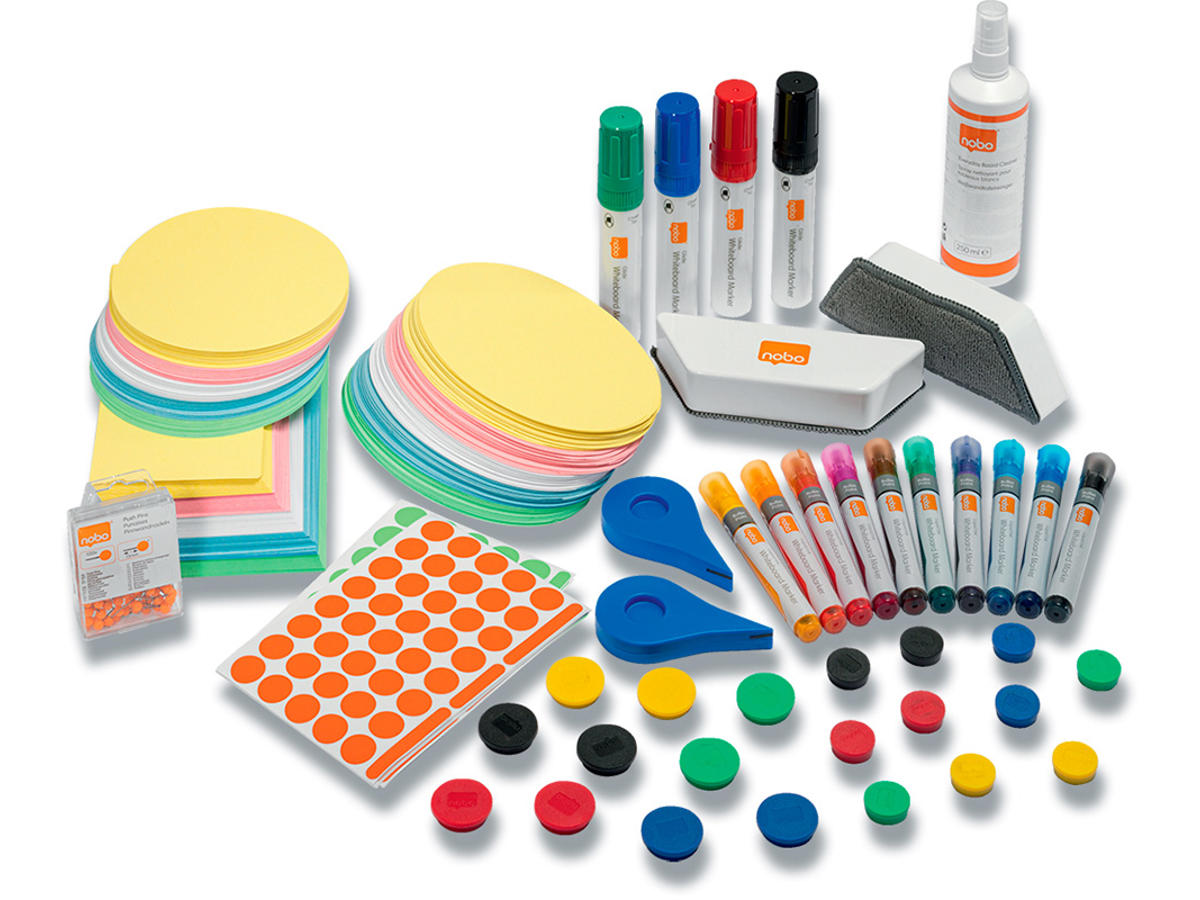 - Indeholder 10 x assorterede whiteboardmarkere med rund spids, 4 x assorterede Jumbo whiteboardmarkere med skrå spids, 10 x whiteboardmagneter 32 mm, 10 x whiteboardmagneter 24 mm, 2 x tavleviskere til whiteboard, rengøringsspray, 2 x gittertape, 100 x kortnåle, 750 x farvede moderationskort og 1000 x klæbemærker.