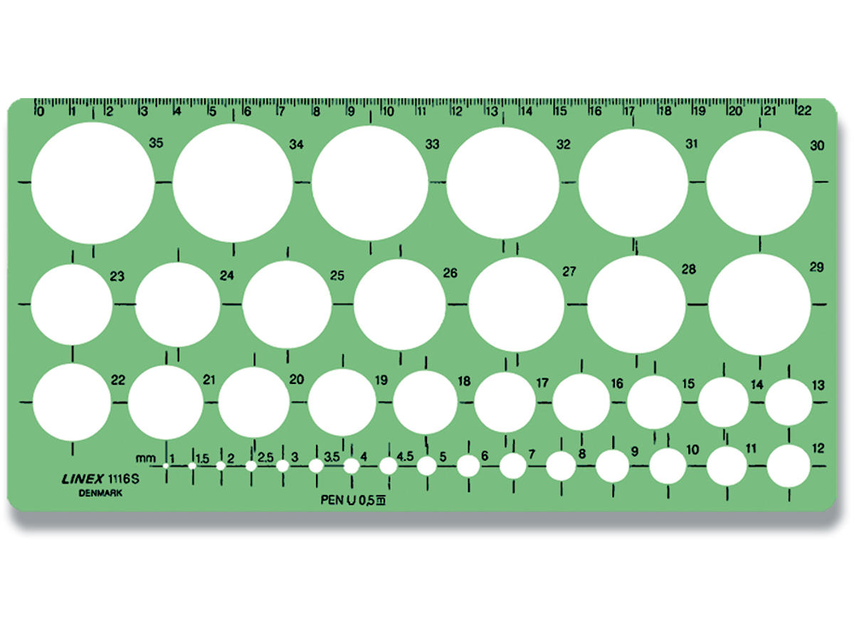 Med tuschknopper. Til pen 0,5 mm. Indholder 39 cirkler med diameter fra 1 til 35 mm inklusive 1,5 – 2,5 – 3,5 – 4,5 mm. Med millimeterinddeling. Materiale: 1,2 mm grøntransparent SBS.