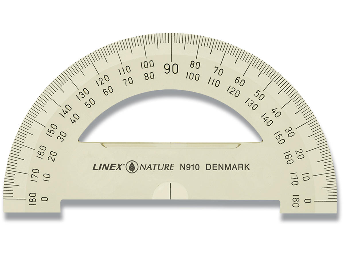 Linex-N910 halvcirkulær vinkelmåler 10 cm i Linex Nature serien lavet af 100% naturmateriale. Selve vinkelmåleren er produceret af gennemsigtig majsstivelse og præget med biologisk nedbrydeligt farve.