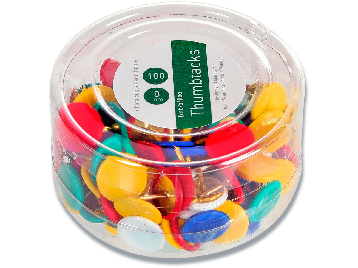 Flade tegnestifter i blandede farver til opslagstavler og lignende. Nålen er 8.5mm. Diameter: 8mm. Æsken indeholder 100 stk.