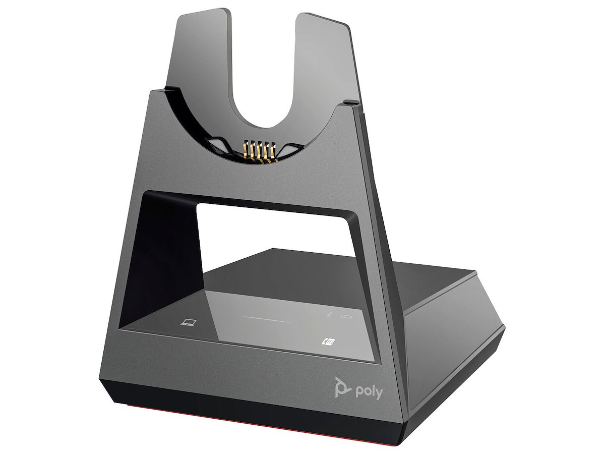 Kompatibel med Poly Voyager 4310-, Poly Voyager 4320- og Poly Voyager Focus 2-headset. Tilsluttes pc via medfølgende USB-A eller USB Type-C, bordtelefon via det medfølgende kabel. Smartphone opretter forbindelse til headset (medfølger ikke) via Bluetooth.