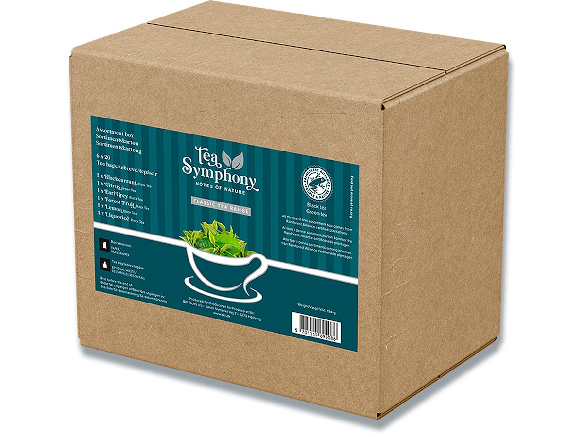 Tea Symphony Mix karton med 120 tebreve giver dig nemt og bekvemt et udvalg af de seks mest populære te varianter i Danmark: Blackcurrant, Citrus green tea, Earl Grey, Forest Fruit, Lemon, Liquorice. Tea Symphony er et nordisk temærke, der kombinerer nordiske smage med østens ekspertise for at dyrke og skabe velsmagende te. Den nye teserie hentes direkte fra BKI's gode samarbejdspartner i Indien til BKI’s lager, hvilket gør at leveringssikkerheden er i top. I serien er alt sort og grønt te RFA certificeret.