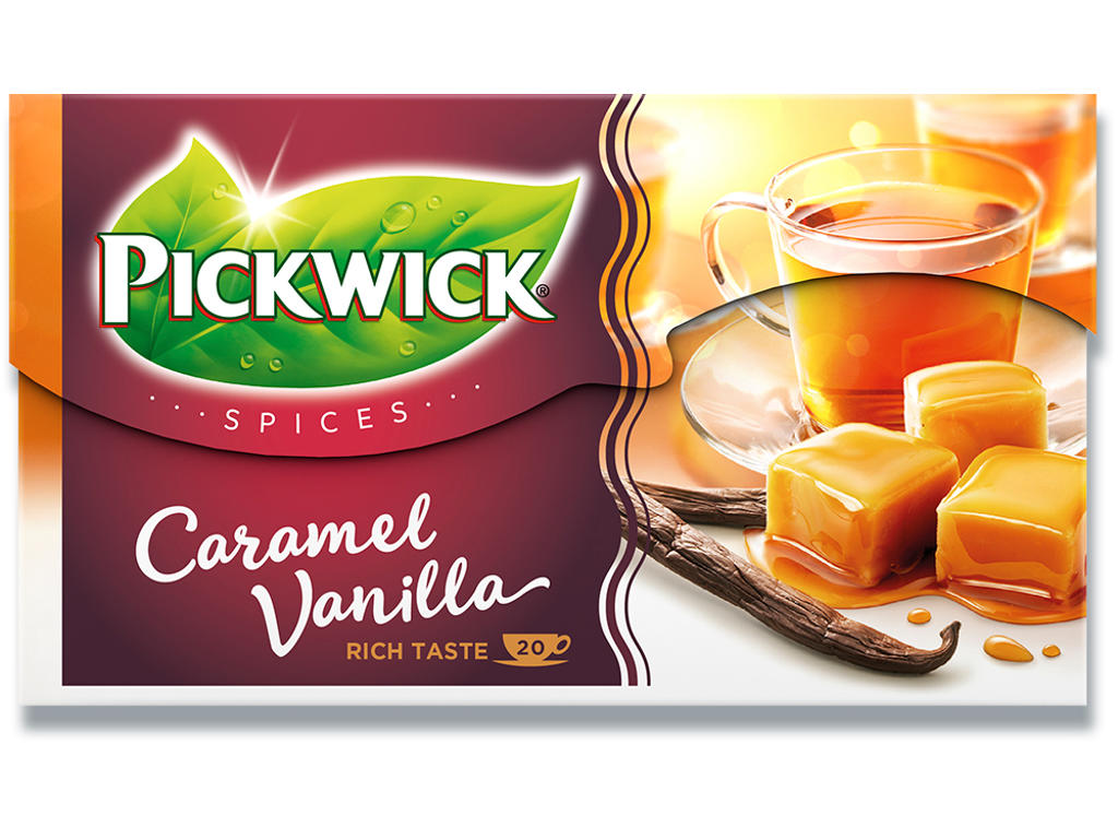 Pickwick Spices Caramel Vanilla har en forførende naturlig duft og smag af karamel og vanilje samt en fyldig sødme og krydrede noter, der afslutningsvist giver teen en let prikkende karakter.