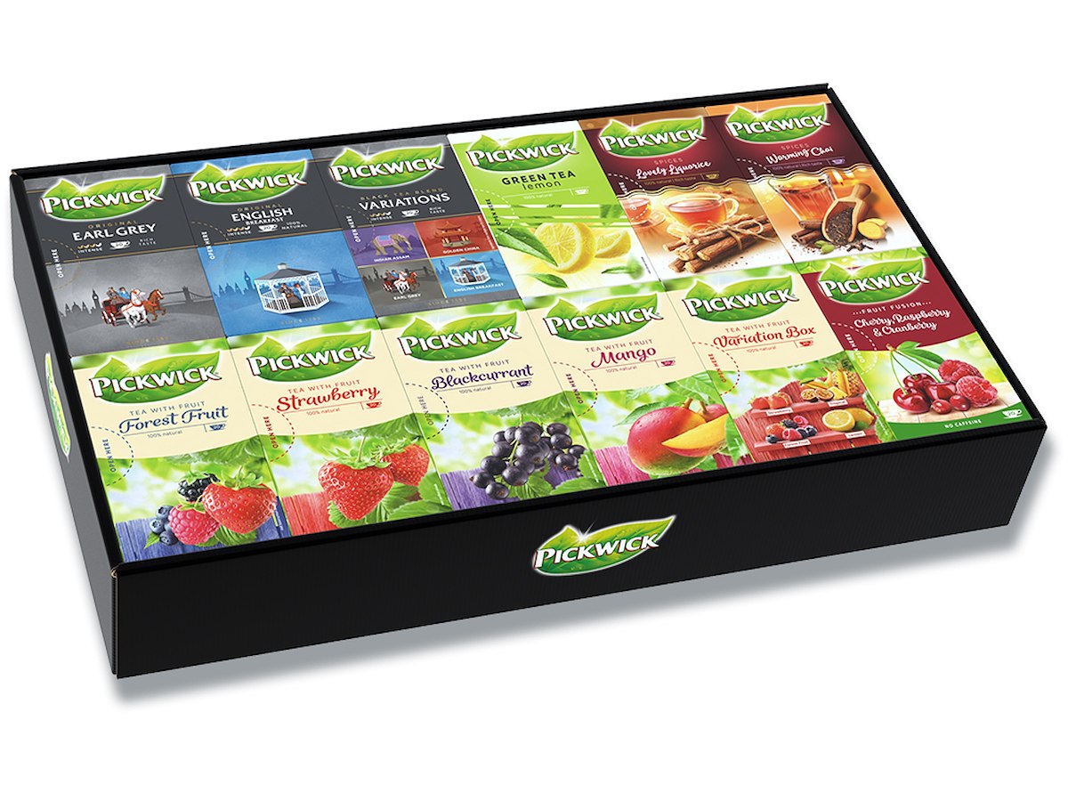 En smart kasse som både er farverig og praktisk at have stående i kantinen, mødelokalet eller hvor man ellers vil have muligheden for at kunne tilbyde en kop te. Kassen indeholder 12 af de populære tevarianter og hver pakke indeholder 20 breve. I denne Pickwick Top 12 æske, findes følgende: Earl Grey, Grøn te m. Citron, Skovbær, Solbær, Grøn te Variation, English Breakfast, Lakridsrod, Jordbær, Chai te, Mango, Frugt te Variation, og Sort te Variation.