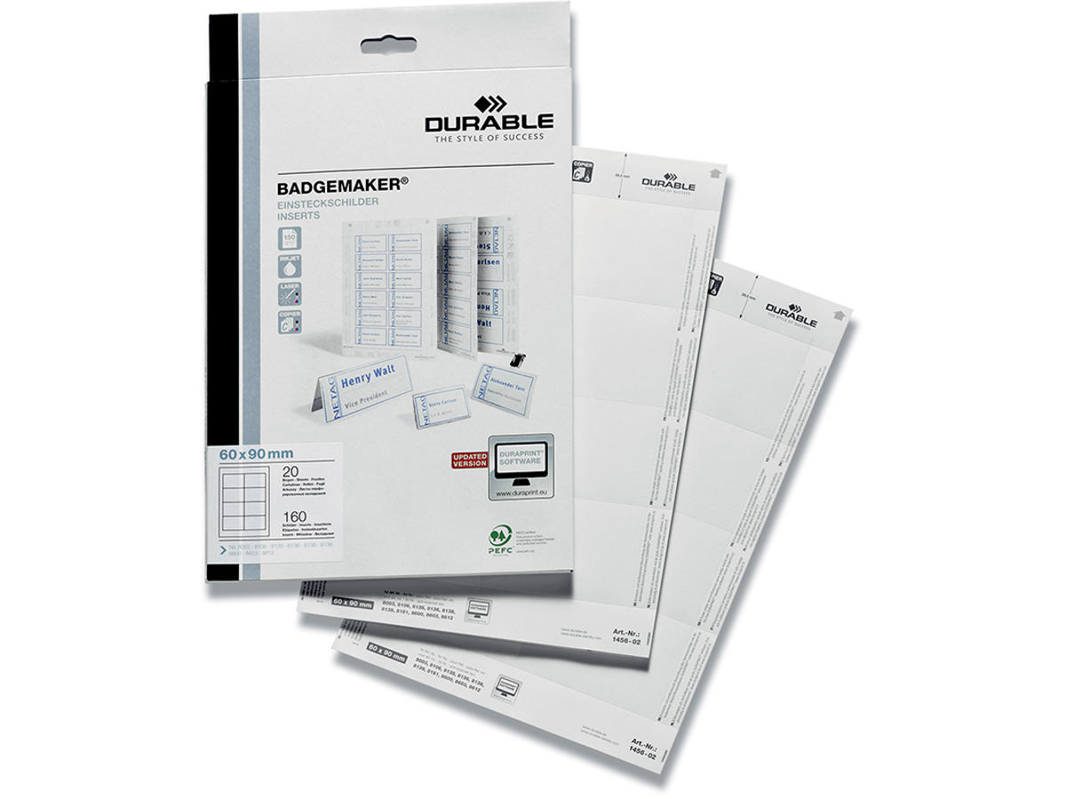 Hvide indstik til navneskilte 60x90mm (tværformat) på 150 g A4 ark. Velegnet til udskrivning i laser, inkjet eller kopi. Lette og skille ad. Pakke med 20 ark giver 160 stk. navneetiketter. Design selv med gratis skabelon - Klik her