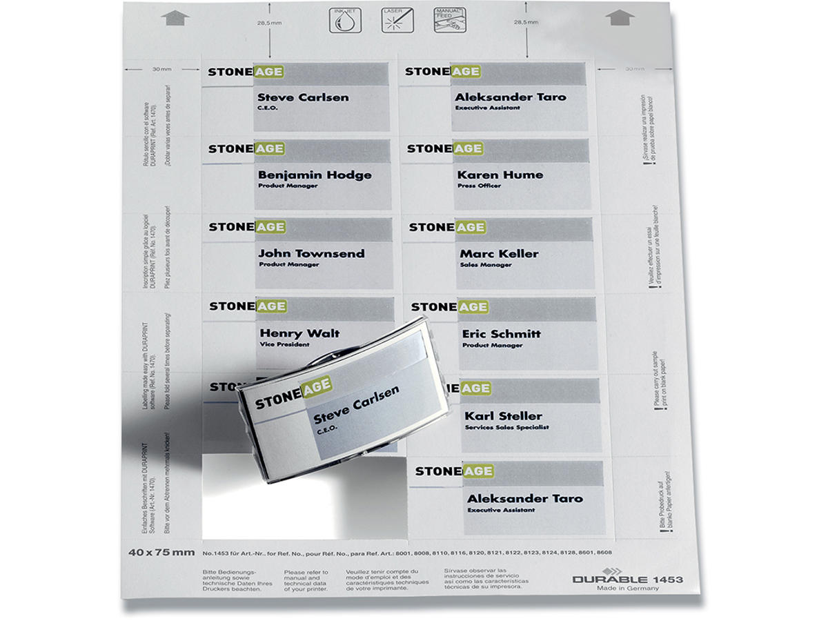 Indstiksetiketter på A4-ark (150 grams papir) til prof. Udskrivning i laser eller inkjet printer. Let at skille etiketterne ad, grundet microperforingerne. Indstiksetiketten 40x75mm (HxB) passer til DURABLEs navneskilte Durable art nr 8001, 8008, 8021, 8110, 8116, 8120, 8124, 8128, 8157, 8210, 8211, 8212, 8601, 8608 og 8694. Pakken består af 20 indstiksark der giver 240 stk etiketter. Anvend DURAPRINT online, som hjælp til at udskrive og design af dit personlige indstiksark - Klik her