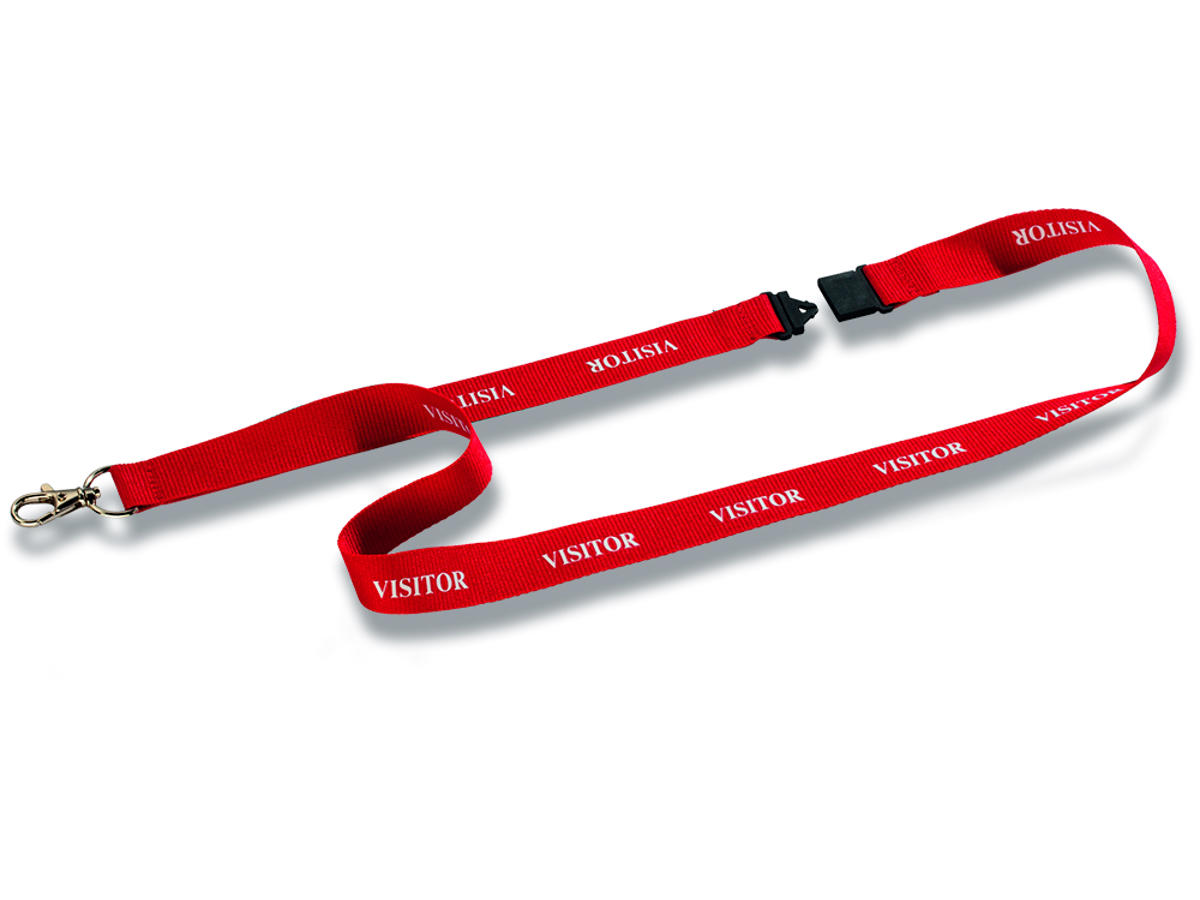 • Rødt tekstilhalsbånd med hvid tekst "VISITOR"