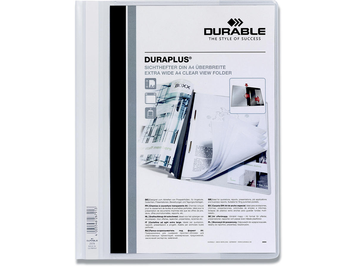 Tilbudsmappe A4 overstørrelse format der kan indeholde faneblade, registre eller hullede plastlommer. Farvet bagside og klar dobbelt forside til indstik af f.eks. brochureblad. Med split, overligger og etiketstrimmel. Transparent vertikal indvendig lomme på bagsiden, til løse dokumenter. Fuld længde dæk skinne til at forbedre udseende og forhindre skader på split mekanisme kan fås, Durable art nr 2924. Kapacitet: ca. 180 ark.