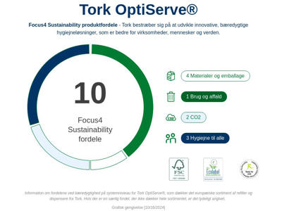 Tork OptiServe® Toiletpapir uden hylse er et højkapacitets toiletpapirsystem til faciliteter, hvor effektivitet, bæredygtighed og den gode oplevelse går hånd i hånd. Det er et bedre alternativ til konventionelt toiletpapir og traditionelle jumboruller. Det brede udvalg af dispensere betyder, at de forskellige behov på faciliteten kan dækkes af bare én type toiletpapir. Sammenlignet med konventionelt toiletpapir, har Tork OptiServe Toiletpapir uden hylse 3 x mere papir og er uden hylse og indpakning, hvilket giver meget mindre spild