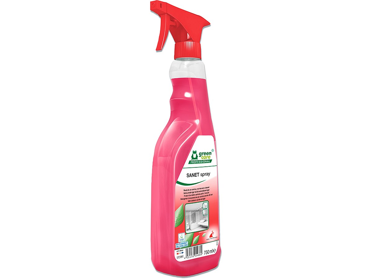 SANET spray er et effektivt klar-til-brug produkt, som fjerner alt almindeligt snavs i sanitære områder, f.eks. kalk, sæbe til forebyggelse af kalksten samt fedtpletter og kosmetikrester. Efter rengøring med SANET spray gendannes sanitære overfladers oprindelige glans. SANET spray er enkel at anvende og også tids- og omkostningsbesparende. SANET spray efterlader en stærk, karakteristisk og langvarig duft af renhed. Takket være SANET sprays miljøvenlige og milde sammensætning kan det anvendes sikkert i badeværelser og sanitære områder, som f.eks. på hoteller, i kontorbygninger samt i offentlige og private faciliteter. SANET spray er yderst velegnet til daglig vedligeholdende rengøring af håndvaske, fliser, keramik, brusere osv. Må ikke anvendes på materialer, der er følsomme over for syre som f.eks. marmor. Brusehovede med arbejdsmiljøvenlig skumfunktion, der mindsker spredning af sundhedsskadelige aerosoler.