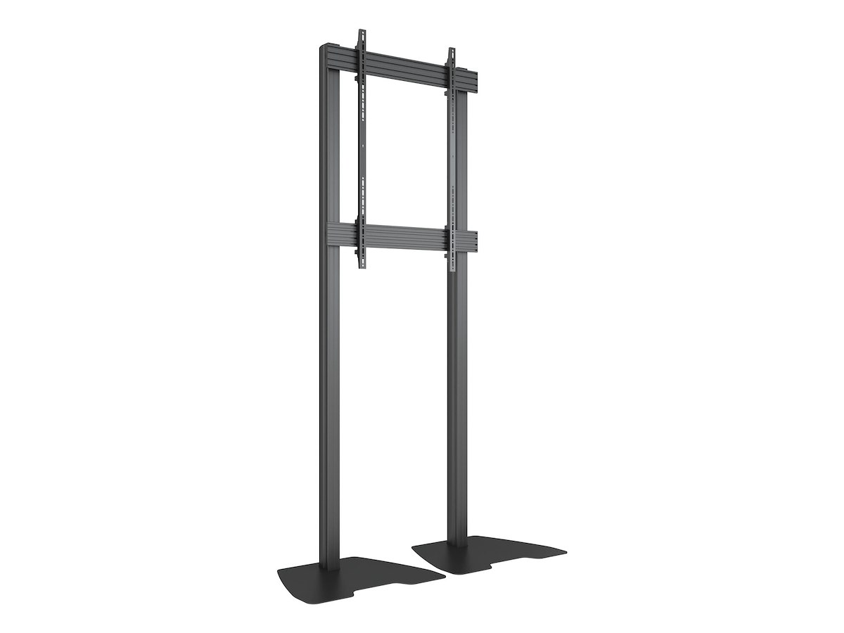 With a durable aluminum build and black textured powder coating, this floorstand provides tool-free height adjustment and supports VESA configurations up to 600x1200 mm. Lockable swivel castors ensure smooth transportation and secure positioning, making it ideal for both fixed and mobile use cases.