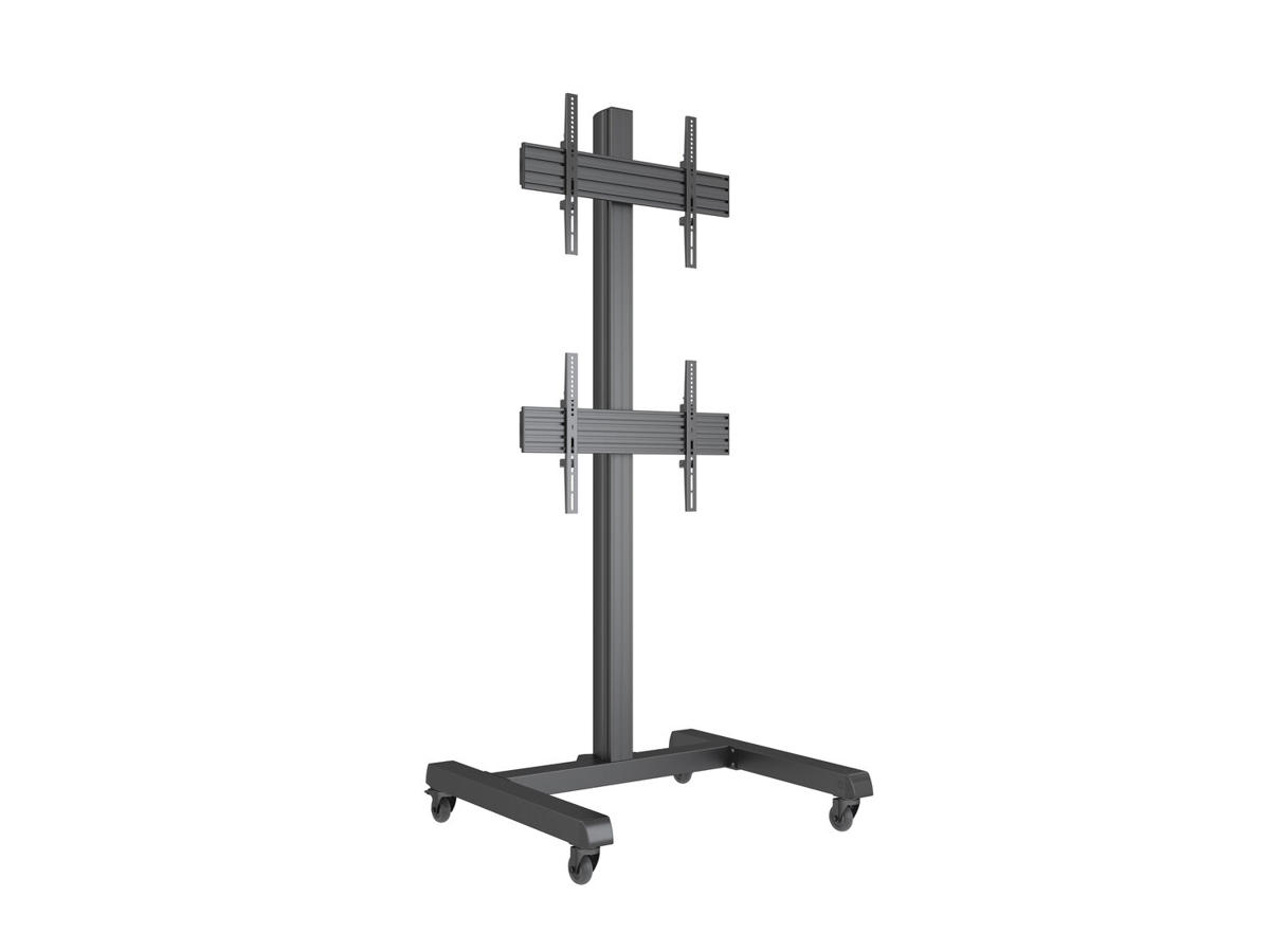 Now you can mount flat panel screens up to 55" displays on a movable Floorstand. With its black, textured powder coat finish it helps hide finger prints or dust. This Floorstand features an easy to position display height adjustment function that is unique. This innovative design with a built in stopper mechanism into the two columns creates a tool free and effortless TV height adjustment. This function reduces time consuming adjustments of height that is used on other floorstands. Now you in seconds can match your audience wheter its sitting or standing up. For fast installation the base comes pre-assembled. VESA specifications ranges from 200x200 up to 1000x600 VESA display mounting pattern, and sturdy swivel casters – two of which are lockable to keep the Floorstand in it´s place. The integrated cable management system that helps keep your cables organized and out of the way. During its introduction this versatile Floorstand also comes with accessories such as the component shelf and camerashelf included as standard.
