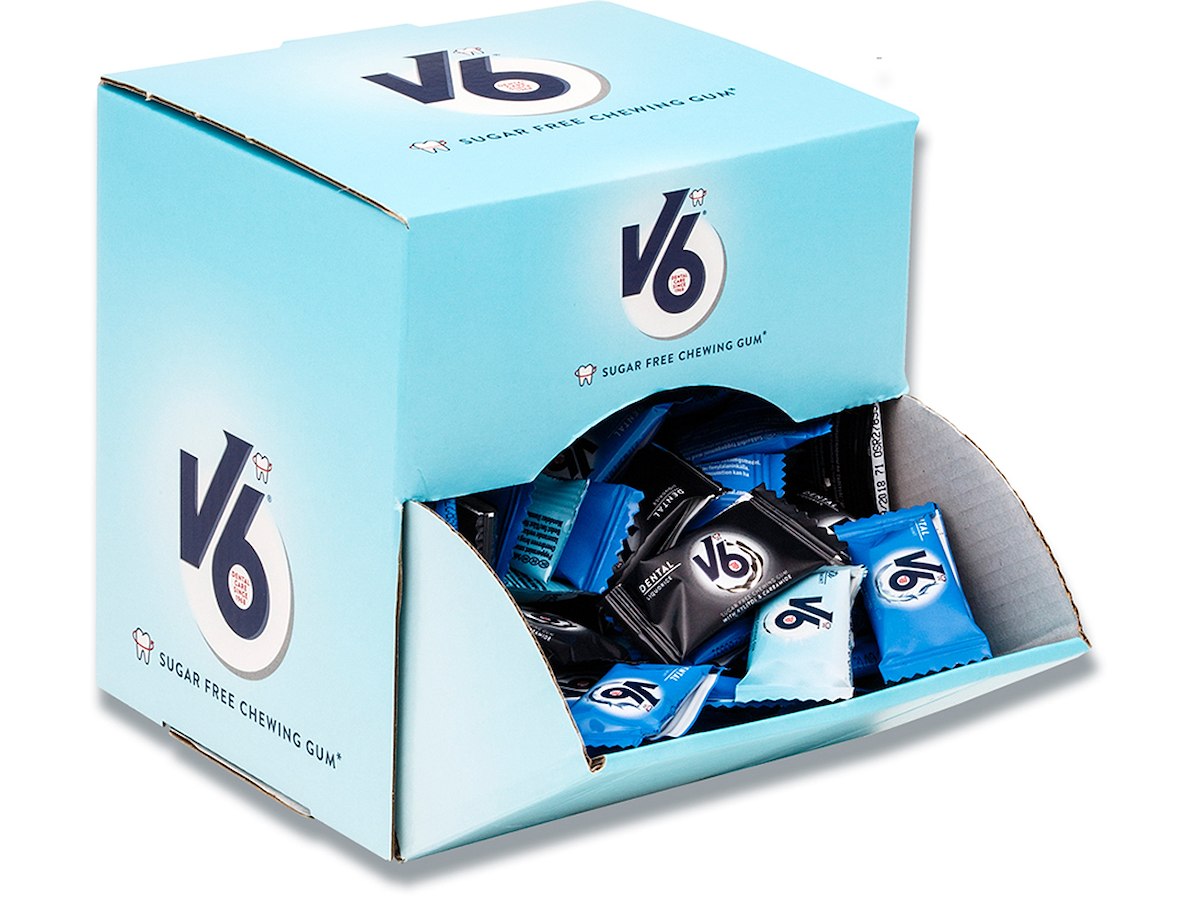 V6 er et sukkerfrit tyggegummi der bidrager til at neutralisere plaksyrer. Den gavnlige effekt opnås ved at 1-2 stykker tyggegummi tygges mindst 20 minutter mindst tre gange om dagen, efter indtagelse af mad eller drikke. Nydes som en del af en varieret og afbalanceret kost og en sund livsstil.