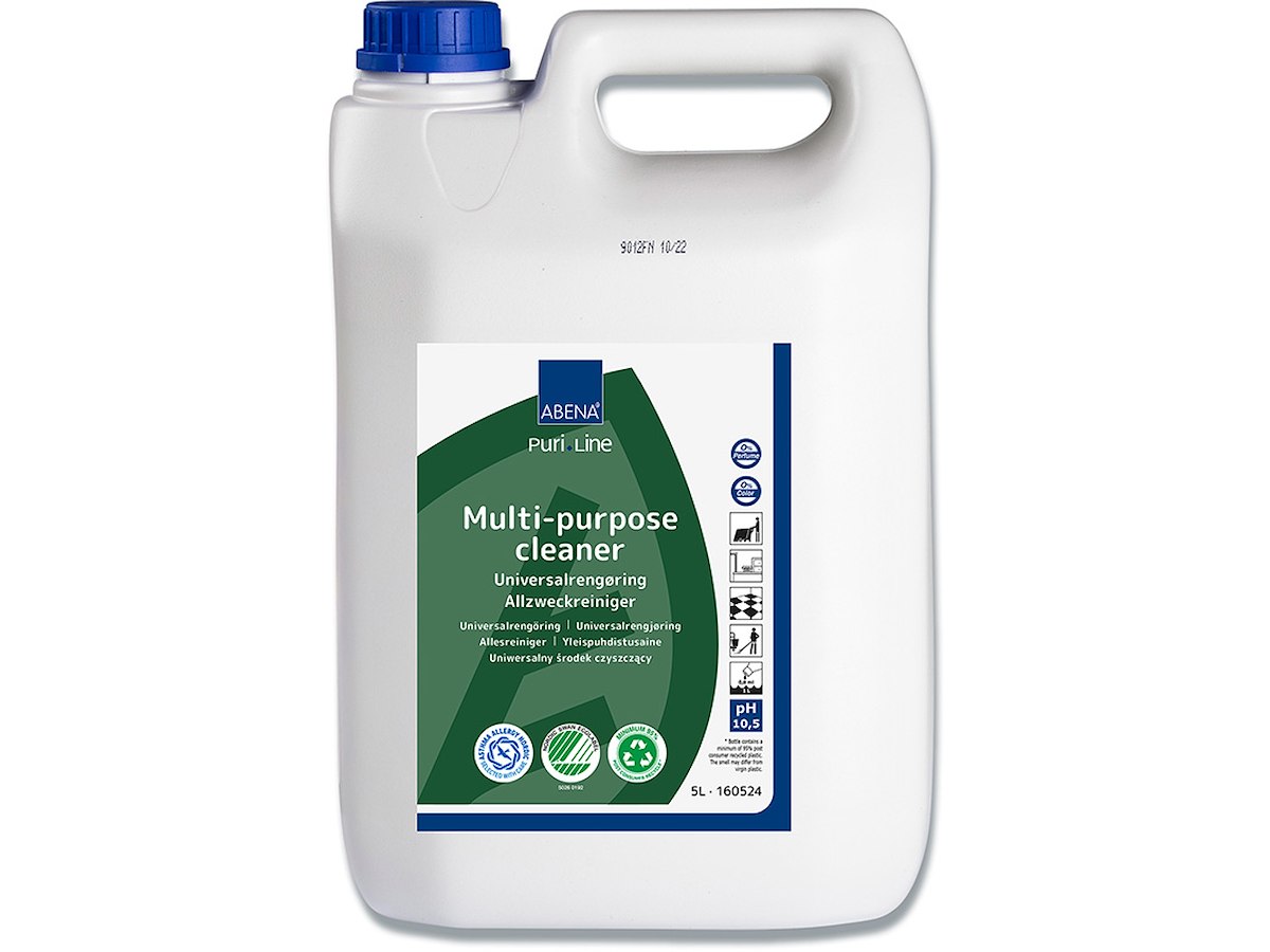 Med AABENA's Universalrengøring får du en effektiv løsning til den daglige rengøring. Dette produkt er ideelt til alle overflader, der tåler vand, og det fjerner nemt fedt, snavs m.m. Vores universalrengøringsmiddel er Svanemærket, hvilket sikrer dig et ansvarligt valg uden at gå på kompromis med kvaliteten. Dosér produktet efter doseringsinstruktionerne. Påføres overfladen med en mikrofiberklud eller inventarmoppe. 0,8-2 ml til 1 L vand. Brugsopløsningens pH-værdi: 7-8. Det anbefales at anvende pumpe eller doseringsbæger for nøjagtig dosering, hvis ikke produktet er tilkoblet et automatisk doseringsanlæg.