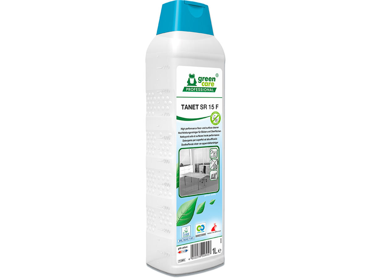 TANET SR15 F er et virkningsfuldt rengøringsmiddel til vedligeholdelse af gulve og andre flader. Det inde holder hverken parfume eller farvestoffer og har fremragende miljøegenskaber. Med respekt for den biologiske cyklus tager midlet hensyn til menneskers helbred og rengøringspersonalets sikkerhed. Samtidig med forbedring af arbejdssikkerheden sikrer den usædvanligt gode virkning ved lav anvendelses koncentration af TANET SR15 F fremragende rengøring med minimal anstrengelse og omkostning. Midlets gode befugtningsegenskaber sikrer nem og grundig fjernelse af snavs og fedt fra porøse stengulve og selv fra vandskyende flader såsom PUR uden at efterlade striber. Idet TANET SR15 F overvejende består af fornyelige ressourcer og fuldstændigt afstår fra parfume og farve, påtager vi os ansvaret for de kommende generationer.