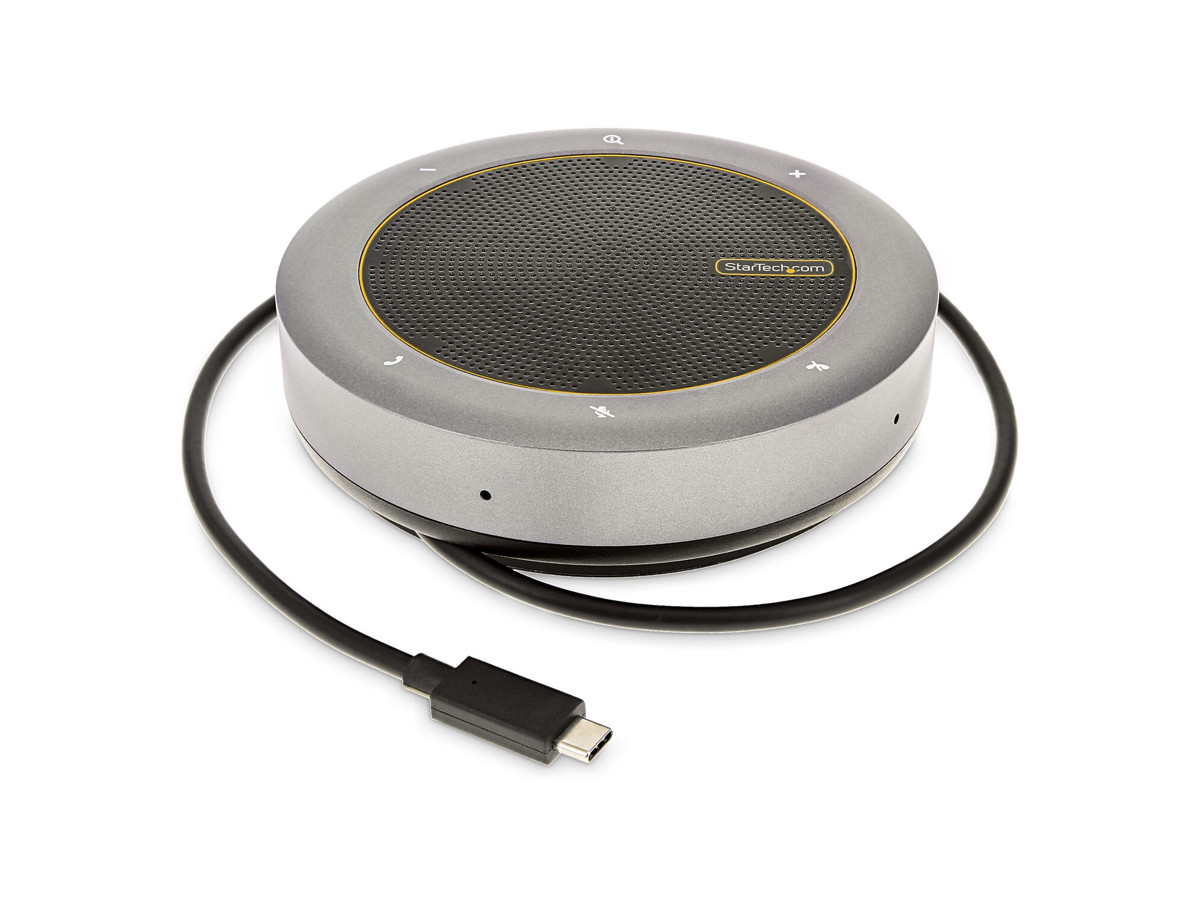 This USB Type-C Conference Speaker Mini Dock features a speakerphone, HDMI/VGA video output, USB-C PD pass-through/data, a USB-A x2 hub, a built-in USB-C host cable, and tap/touch buttons with LED indicators. It simplifies a workstation setup, converting any desk into a teleconferencing space. The dock features HDMI or VGA single-video output. It has 2 USB-A ports and a USB-C port with the option for Power Delivery (PD) pass-though.. The Conference Speaker Dock connects to the host device, using a built-in wraparound 22 in. (56 cm) USB-C host cable. Connect this host cable to a USB-C or Thunderbolt 3/4™ port.
