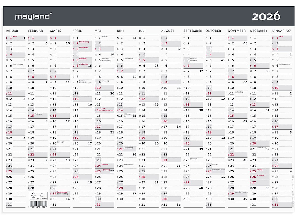 Kontorkalender i karton og moderne design med 13 månedsoversigt. Vægkalenderen giver dig en oversigt over alle 12 måneder i året samt for januar det efterfølgende år. Med årskalenderen kan du hurtigt og nemt skabe et godt og overskueligt overblik over året og alle dets aktiviteter.