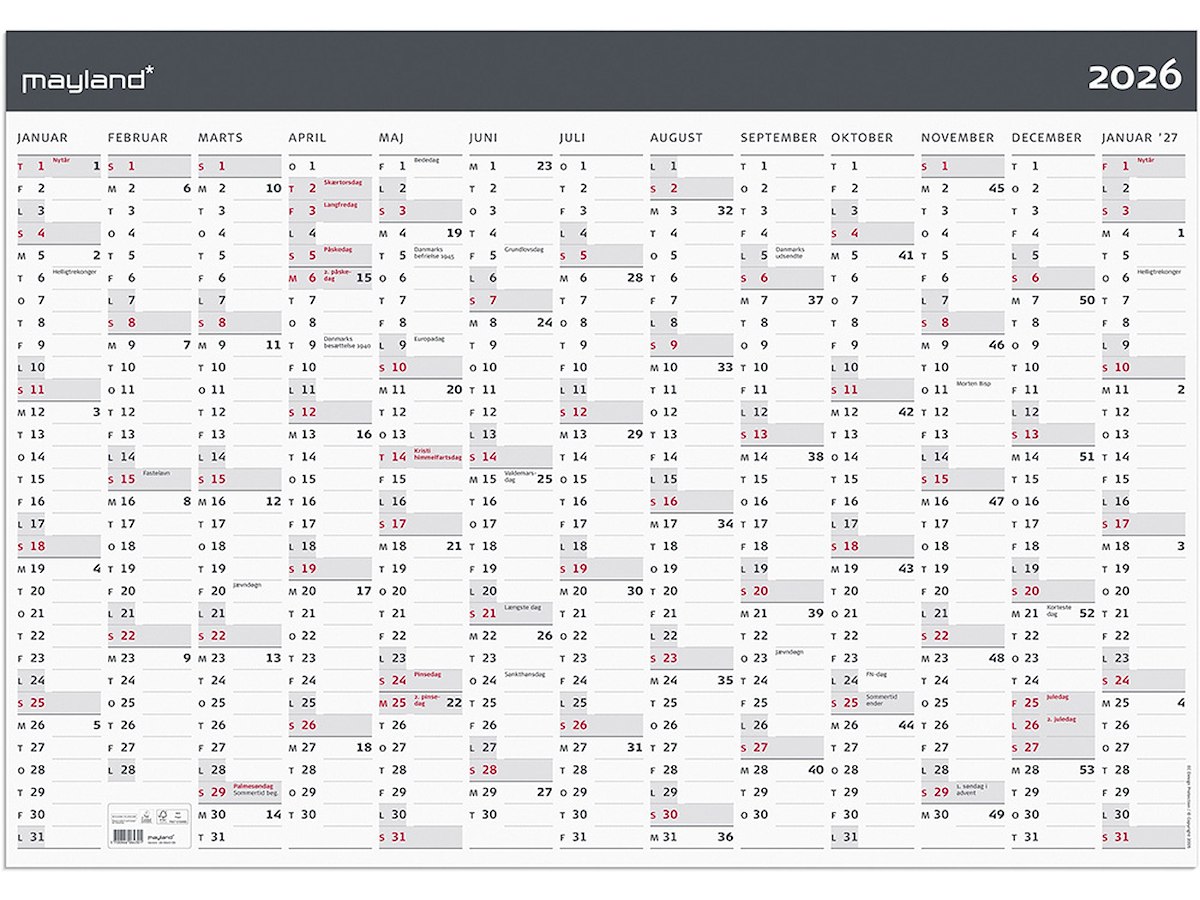 Kæmpekalender 70x100 cm i kraftigt papir og moderne design med 13 månedsoversigt. Vægkalenderen giver dig en oversigt over alle 12 måneder i året samt for januar det efterfølgende år. Med årskalenderen kan du hurtigt og nemt skabe et godt og overskueligt overblik over året og alle dets aktiviteter.