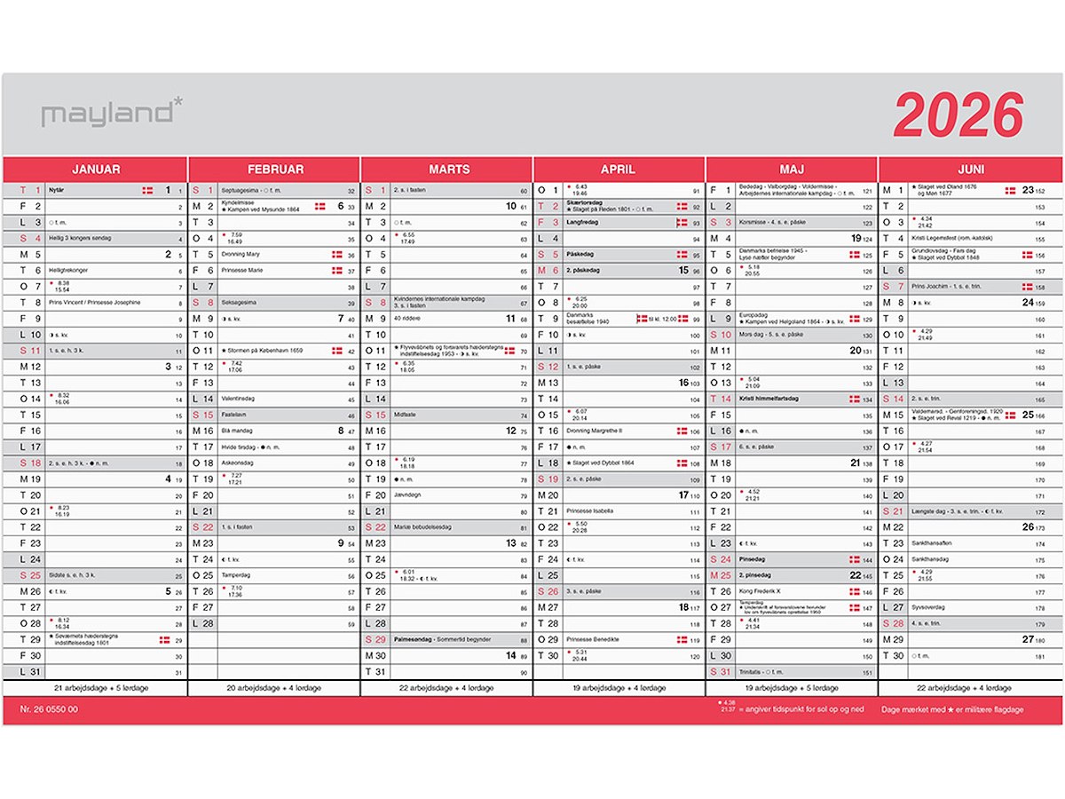 Vendbar flagkalender i karton med 2x6 månedsoversigt. Vægkalenderen giver dig en oversigt med 6 måneder ad gangen, så du hurtigt og nemt kan skabe et godt og overskueligt overblik over året og alle dets aktiviteter. Dertil viser kalenderen officielle flagdage, antal arbejdsdage pr. måned, månefaser samt solens op- og nedgangstider.