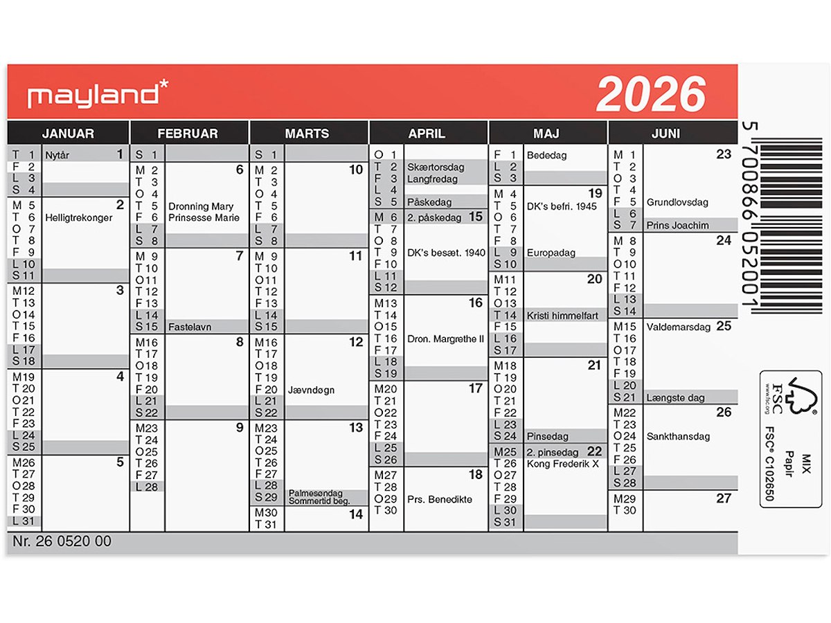 Vægkalender, 2026, Mini, 6 måneder pr. side, Mayland